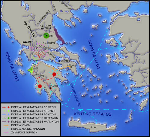 Χάρτης με τις μεταναστεύσεις των ελληνικών φύλλων μεταξύ του 1125 και 1100 π.Χ.