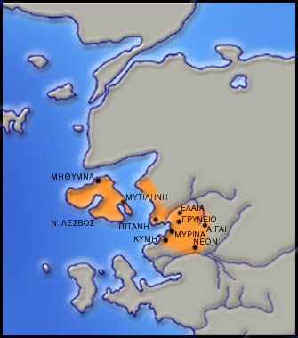 Χάρτης της περιοχής των αιολικών αποικιών με το θρησκευτικό τους κέντρο Γρύνειο.