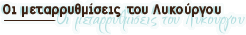 Αν και η σύγχρονη έρευνα αμφισβητεί την ιστορικότητα του προσώπου του Λυκούργου, οι μεταρρυθμίσεις που του αποδίδονται σκιαγραφούν αδρομερώς τις αρχές της σπαρτιατικής πολιτείας. Οι δύο βασιλείς από τις οικογένειες των Aγιάδων και των Ευρυποντιδών διέθεταν περιορισμένες εξουσίες. Συμμετείχαν στη Γερουσία, ηγούνταν του στρατού, κατείχαν ένα τέμενος (υποστατικό) στις περιοχές των περιοίκων και δικαιούνταν μεγαλύτερο μερίδιο |