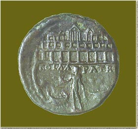 Coin of the reign of Commodus (177-192 A.D.), from Patrae. It shows a view of the harbour of Patrae from seaward. In the background can be made out rows of columns, of temples and other buildings; in the foreground there is a picture of a ship and a statue of a male form.