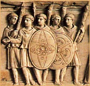 Soldiers belonged to the small landowners class. They received land in exchange for the military services they offered the Empire. Soldiers, detail from an ivory relief from Brescia, Italy. 4th century. Per concessione dei Civici Musei d' Arte e Storia di Brescia. Crippa, M., Zibawi, M., L' art paleochretien: Des Origines a Byzance, Editions Zodiaque Desclee de Brouwer, Paris 1998, pl. 58. © Commune di Brescia Direzione Civici Musei d' Arte e Storia |