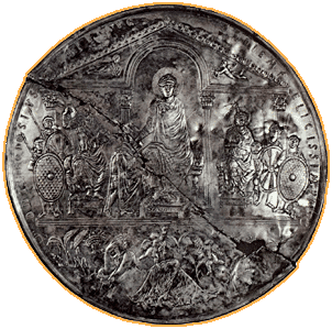 Silver plate (missorium) commemorating the tenth anniversary of the emperor's accession. Theodosios is shown flanked by his two heirs, Arkadios and Honorius, 388 AD. Madrid, Real Academia de la Historia. Kitzinger, E., Byzantine Art in the Making: Main lines of stylistic development in Mediterranean Art 3rd-7th century, Harvard University Press, Cambridge, Massachusetts 1995, p. 31, pl. 57. © Real Academia de la Historia, Madrid |