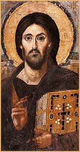 Christ Pantokrator: painted wooden panel encaustic icon, early half of the 6th century. Saint Catherine Monastery, Sinai. Vokotopoulos, P., Helleniki Tehni: Byzantines Eikones, Ekdotike Athenon S.A. Athens 1995, p. 30, ill. 2. © Saint Catherine Monastery, Sinai |