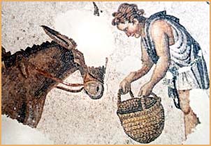 Slaves were the lowest social class in Byzantium: a servant feeding the pack mule, from a mosaic in the Great Palace, Constantinople, ca. 7th century. Ankara, Ministry of Culture General Directorate of Monuments and Museums. Jobst., W., Behcet, E., Gurtner, C., Istanbul The Great Palace Mosaic: The story of its exploration preservation and exhibition, (1983-1997) Osterreichische Akademie der Wissenschaften, Wien 1997, p. 49, ill. 34. © Ministry of Culture General Directorate of Antiquities and Museums, Ankara |