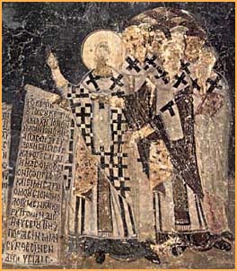 Wall painting from the southern section of the western arch of the Refectory in the monastery of St John the Theologian, depicting the 4th Ecumenical Council, which was organized during the reign of Marcian and which condemned Monophysitism. Third quarter of 13th century. Rhodes, 4th Ephorate of Byzantine Antiquities. Ministry of Culture/Archaeological Receipts Fund. Kollias, H., Patmos: Psifidota Toihografies, "MELISSA" Publishing House, Athens 1990, p. 28, ill. 26. © Hellenic Ministry of Culture |