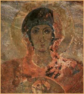 Panagia Nikopoios: detail of the wall-painting from the northern conch of the Church of Panagia Drossiani, Naxos. Circa 600 AD. Athens, 2nd Ephorate of Byzantine Antiquities. Ministry of Culture/Archaeological Receipts Fund. Chatzidakis, N., Byzantini Tehni stin Ellada: Naxos, "MELISSA" publishing house Athens 1989, p. 25, ill. 9. © Hellenic Ministry of Culture |