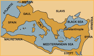 Map indicating the borders of the Byzantine Empire during the reign of Constantine the Great.