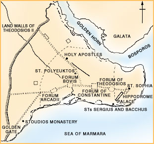 of the Byzantine period: topographic plan of Constantinople.Harrison, M., A Temple For Byzantium: The Discovery and Excavation of Anicia Juliana's Palace-Church in Istanbul, University of Texas Press, Austin, Harvey Miller LTD, London 1989, p. 35, ill. 30. © FHW Processed by the Foundation of the Hellenic World |