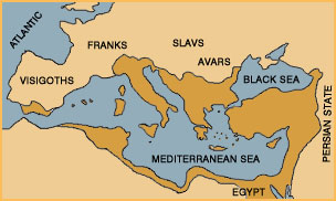 Map indicating the borders of the Byzantine Empire at the end of Justinian's reign.
