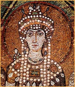 Theodora: detail of mosaic from the southern wall of the sanctuary at the Church of San Vitale, Ravenna, 547 AD. Opera di Religione della Diocesi di Ravenna Chatzidakis, N., Helleniki Tehni: Byzantina Psifidota, Ekdotike Athenon S.A., Athens 1994, p. 36, ill. 7. © Opera di Religione della Diocesi di Ravenna |