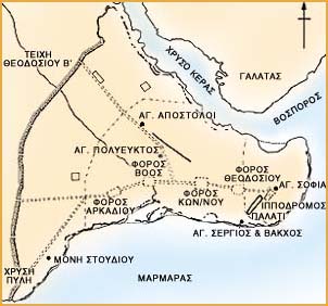 Το 324, έτος ίδρυσης της Κωνσταντινούπολης, σηματοδοτεί την αρχή της Βυζαντινής περιόδου. Στην εικόνα, τοπογραφικό σχέδιο της Κωνσταντινούπολης. Harrison, M., A Temple For Byzantium: The Discovery and Excavation of Anicia Juliana's Palace-Church in Istanbul, University of Texas Press, Austin, Harvey Miller LTD, London 1989, σ. 35, σχ. 30. © ΙΜΕ Επεξεργασία: Ίδρυμα Μείζονος Ελληνισμού |
