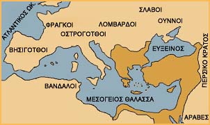 Χάρτης που δείχνει τα σύνορα της βυζαντινής αυτοκρατορίας καθώς και τα γειτονικά κράτη κατά τον 6ο αιώνα.