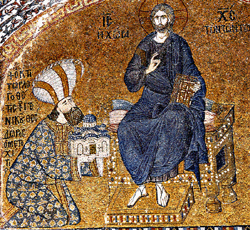 Theodore Metochites is shown offering to the enthroned Christ a model of the church of which he is the donor. Mosaic in the narthex of the Chora monastery. Constantinople, 1315-20.