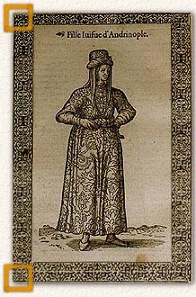 Εβραία κόρη από την Αδριανούπολη. 1577.Ξυλογραφία 13x20 εκ. De Nicolay N., Les navigations, peregrinations et voyages, faicts en la Turquie, 1577, φ. 190. Αθήνα, Συλλογή Ευ. Φινόπουλου.