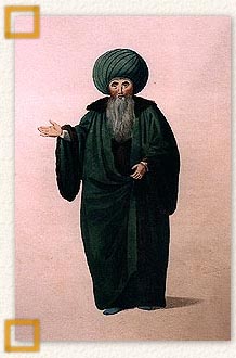 Ο αρχηγός των Ulema. c. 1798.Χαλκογραφία επιχρωματισμένη 26x36 εκ. Σχέδιο Octavien Dalvimart.Miller W., The costume of Turkey, London 1802, εικ. 3. Αθήνα, Συλλογή Ευ. Φινόπουλου.