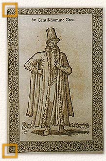 Έλληνας ευγενής. 1577.Ξυλογραφία 13x20 εκ. De Nicolay N., Les navigations, peregrinations et voyages, faicts en la Turquie, 1577, φ. 207. Αθήνα, Συλλογή Ευ. Φινόπουλου.