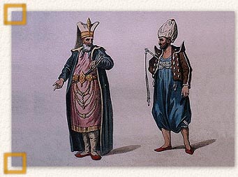 Γιανίτσαροι με ρούχα τελετής. c. 1798. Χαλκογραφία επιχρωματισμένη 26x36 εκ.Σχέδιο Octavien Dalvimart. Miller W. (ed.), The costume of Turkey, London 1802, εικ. 34. Αθήνα, Συλλογή Ευ. Φινόπουλου.