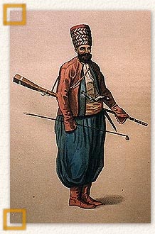 Σπαχής. c. 1798.Χαλκογραφία επιχρωματισμένη 26x36 εκ. Σχέδιο Octavien Dalvimart. Miller W., The costume of Turkey, London 1802, εικ. 43. Αθήνα, Συλλογή Ευ. Φινόπουλου.