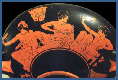 Αττική ερυθρόμορφη κύλικα με παράσταση συμποσίου. Τα συμπόσια αποτελούσαν κατεξοχήν γνώρισμα της ανώτατης αριστοκρατικής τάξης. 490-480 π.Χ.
