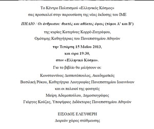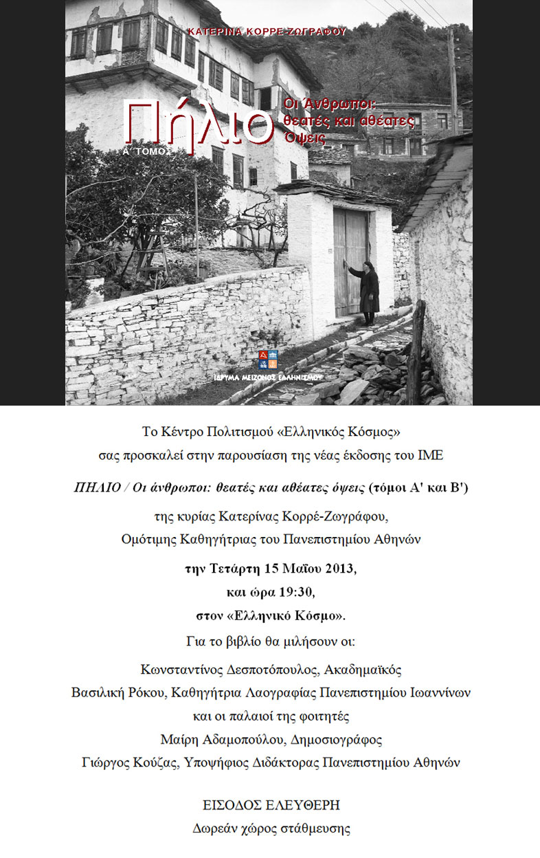 10-05-2013«Πήλιο/Oι άνθρωποι: θεατές και αθέατες όψεις» (Τόμοι Α' και Β') της Κατερίνας Κορρέ-Ζωγράφου Νέα έκδοση του Ιδρύματος Μείζονος Ελληνισμού